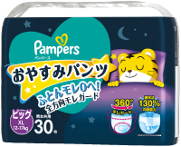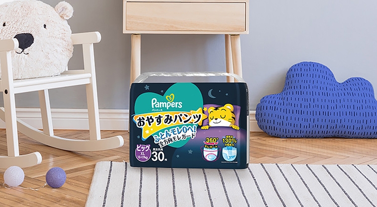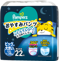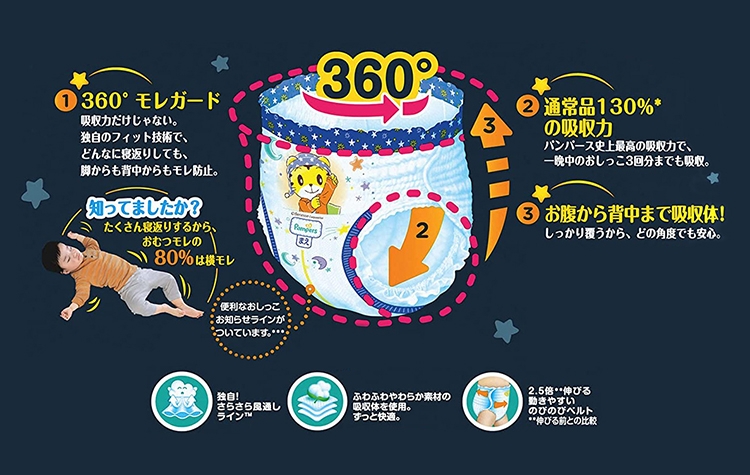 通常のパンパースに比べて130%、夜中のおしっこ約3回分をたっぷり吸収できるので、モレを気にせず朝までぐっすり眠ることができます。