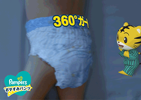 寝返りをしてもモレにくいように、足元や背中、横からのモレを一周ぐるりとガードする、パンパース独自の「360°ガード」です。
